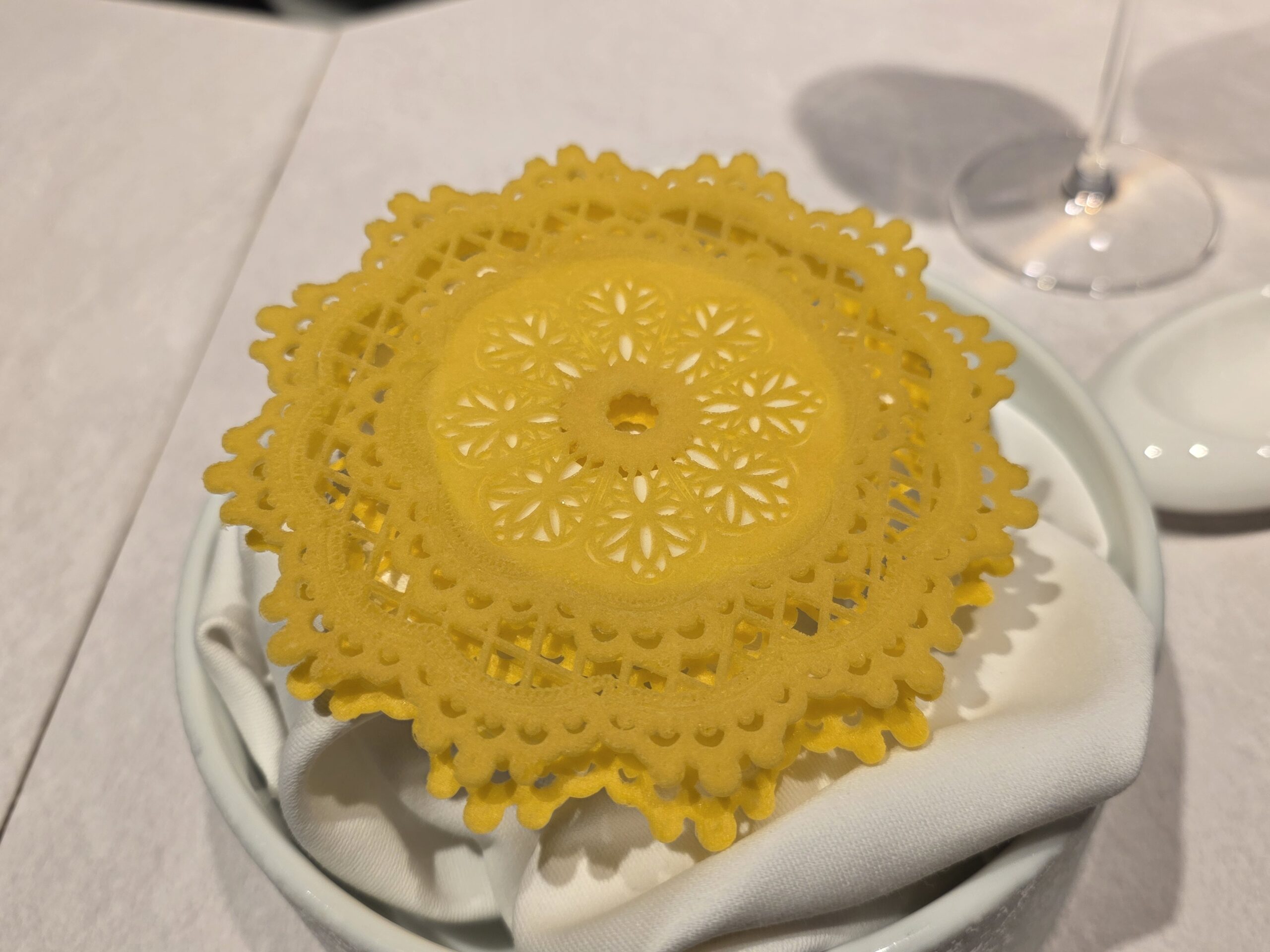 最初の「バターナッツかぼちゃのワッフル」が運ばれてきた瞬間、参加者の皆さんから歓声が上がりました。薄いレース状に焼いたバターナッツで、ペコリーノ・ロマーノのブランマンジェを挟んでいる。手でつまんで一口。軽い食感なのにチーズの旨味がしっかり残る。見た目の美しさと味の満足度、両方ちゃんとある。これは期待できる、と皆さんの表情が変わったのがわかりました。