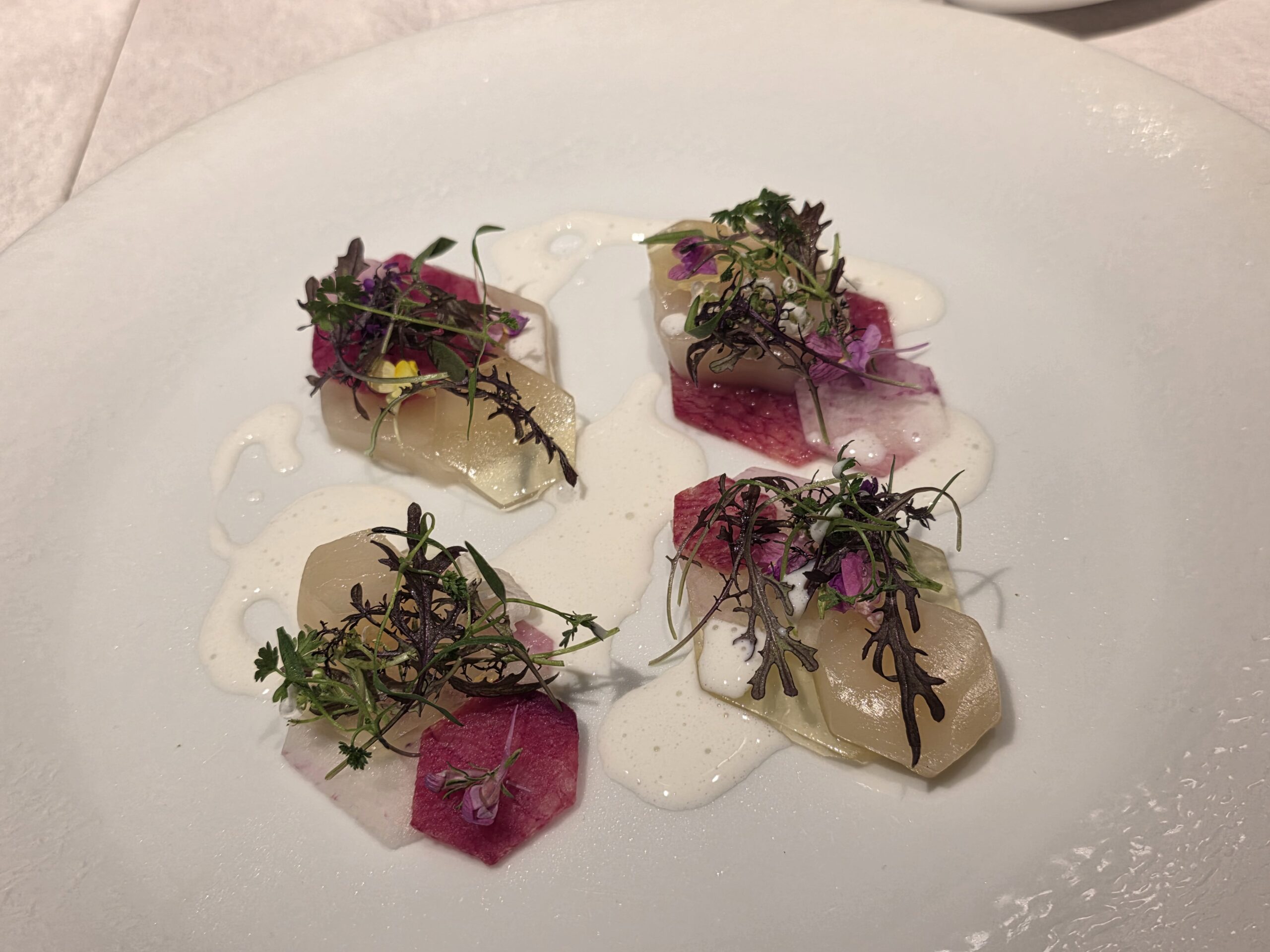 「帆立・林檎・大根」の前菜がとにかく美しかった。生の帆立、紅系の大根、透明な林檎ゼリー、エディブルフラワー。仕上げにギリシャヨーグルトとホースラディッシュのソースをかける。わさびのような清涼感が帆立の甘みを引き立てていて、北欧で修業した経験が活きているなと感じました。参加者同士で「これは何だろう」と話しながら食べるのも、オフ会ならではの楽しさです。