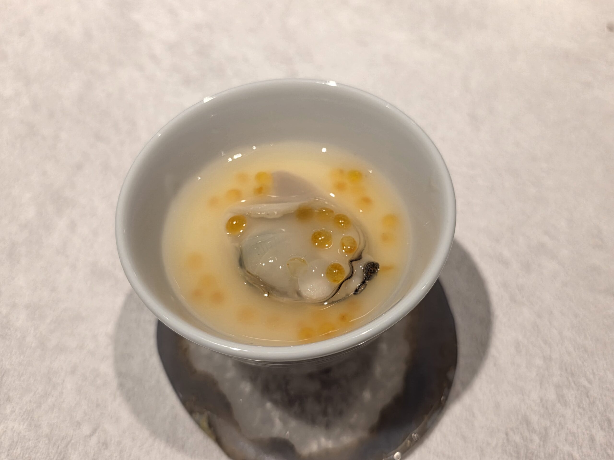 「ハマグリのフラン」も好評でした。ハマグリを加熱したときに出るだし汁でフランを作り、黒トリュフとますこをのせる。貝の旨味とトリュフの香りが重なる贅沢な一皿です。