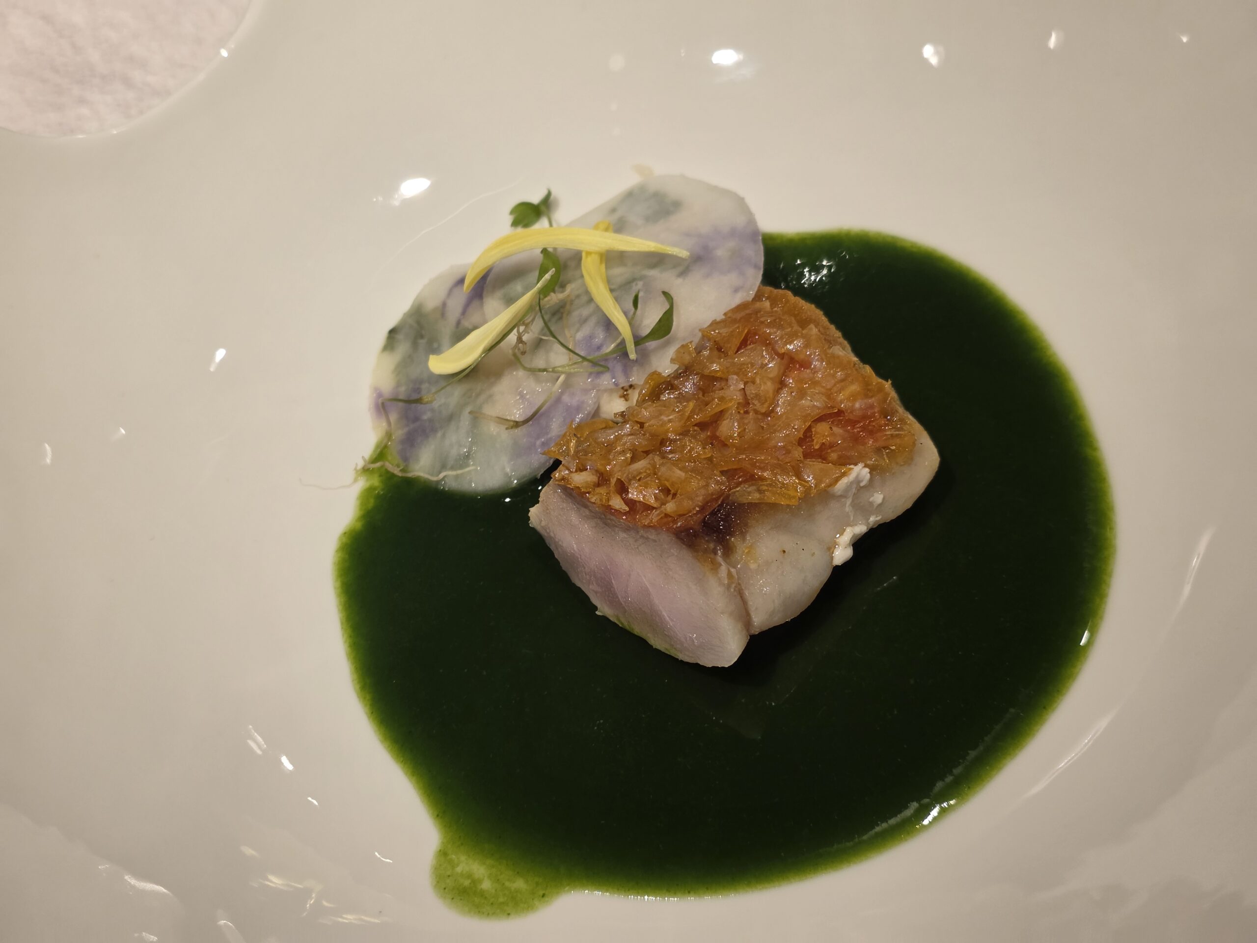 「金目鯛の鱗焼き」は、鱗をパリパリに仕上げて春菊のソースを合わせるという組み合わせ。炙った白子と蕪のスライスが添えられていて、盛り付けがまるで押し花のよう。マルセイユの名店で磨いた技術を感じます。