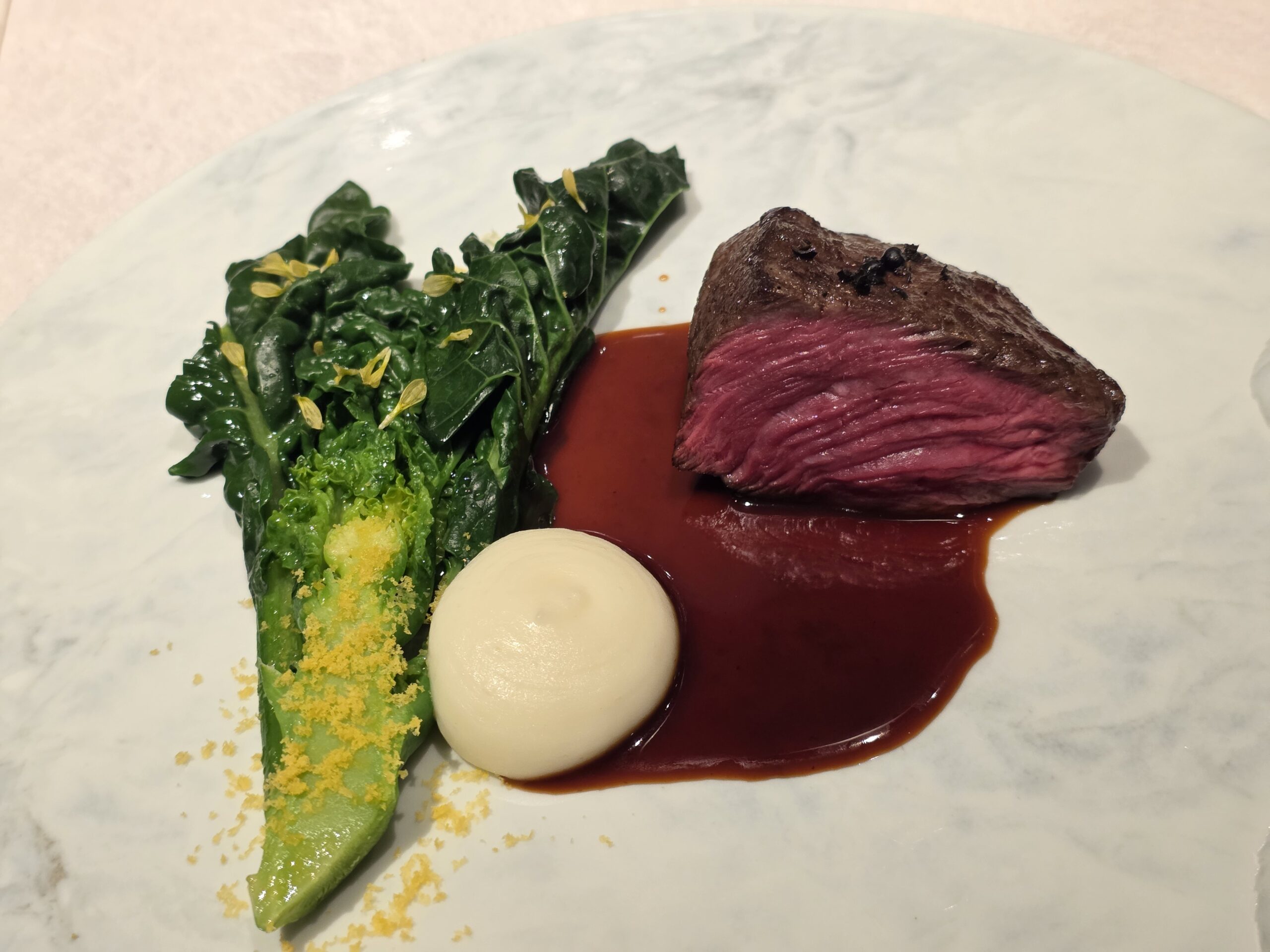 メインの和牛には、アレッタ(ブロッコリーとケールの掛け合わせ野菜)とゆり根のピューレ。派手さで勝負するのではなく、火入れと素材の組み合わせで勝負している印象でした。
