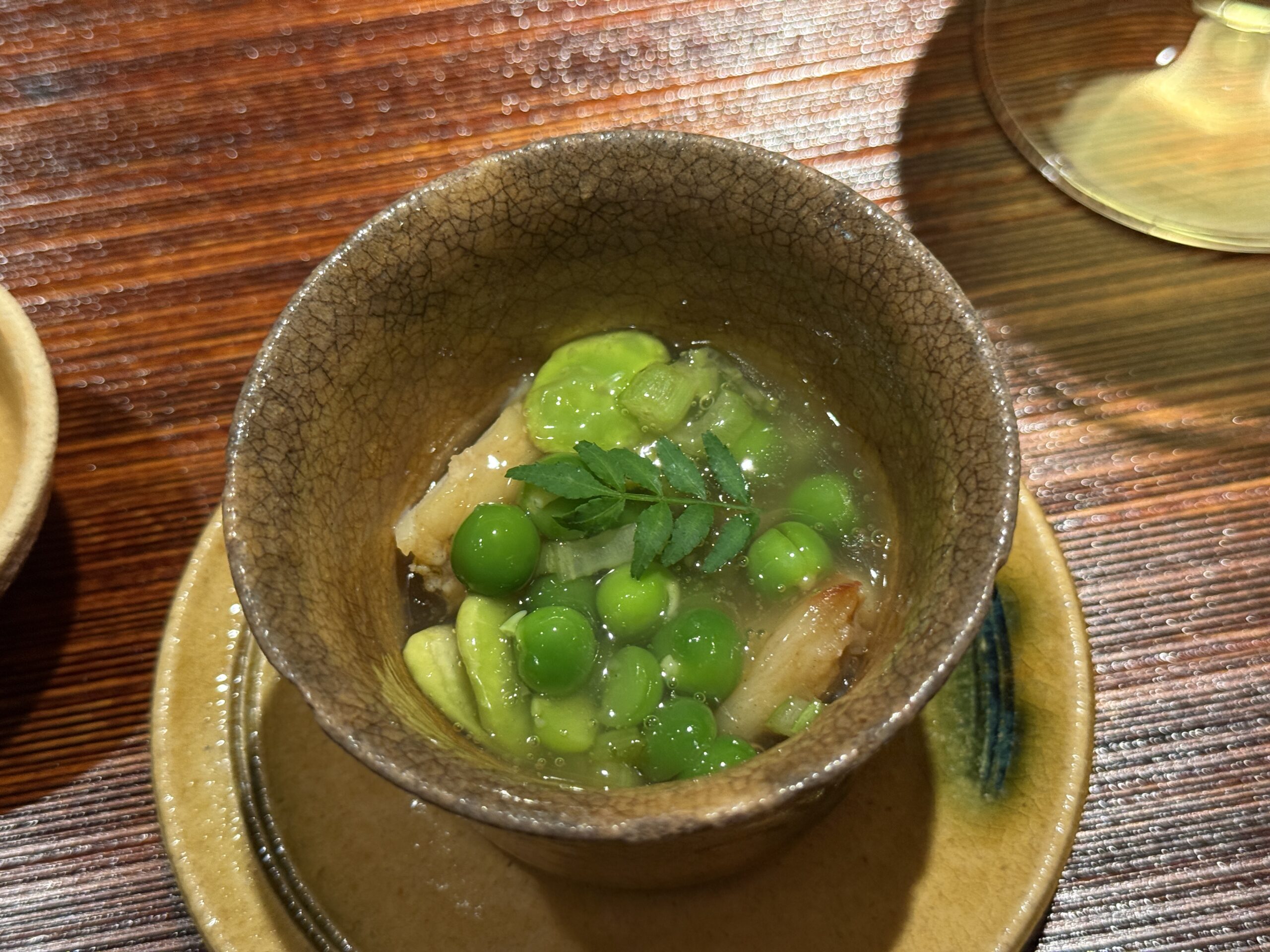 コースの幕開けは、北海道産の北寄貝。翡翠色のグリーンピースと木の芽をあしらい、春の出汁をまとわせた一品だ。口に含むと、貝の甘みと青い豆の清涼感が溶け合い、これから始まるコースへの期待が一気に高まる。