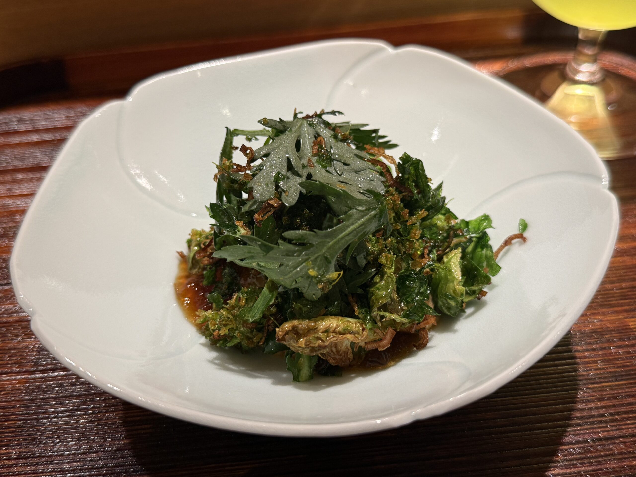 続く余市の鮟肝は冷菜仕立て。ねっとりとした脂の乗りが舌の上でじんわり広がる。京都のメジマグロは山菜と春菊を纏った造りで、若い脂の軽やかさと野趣が同居する面白い一皿だった。