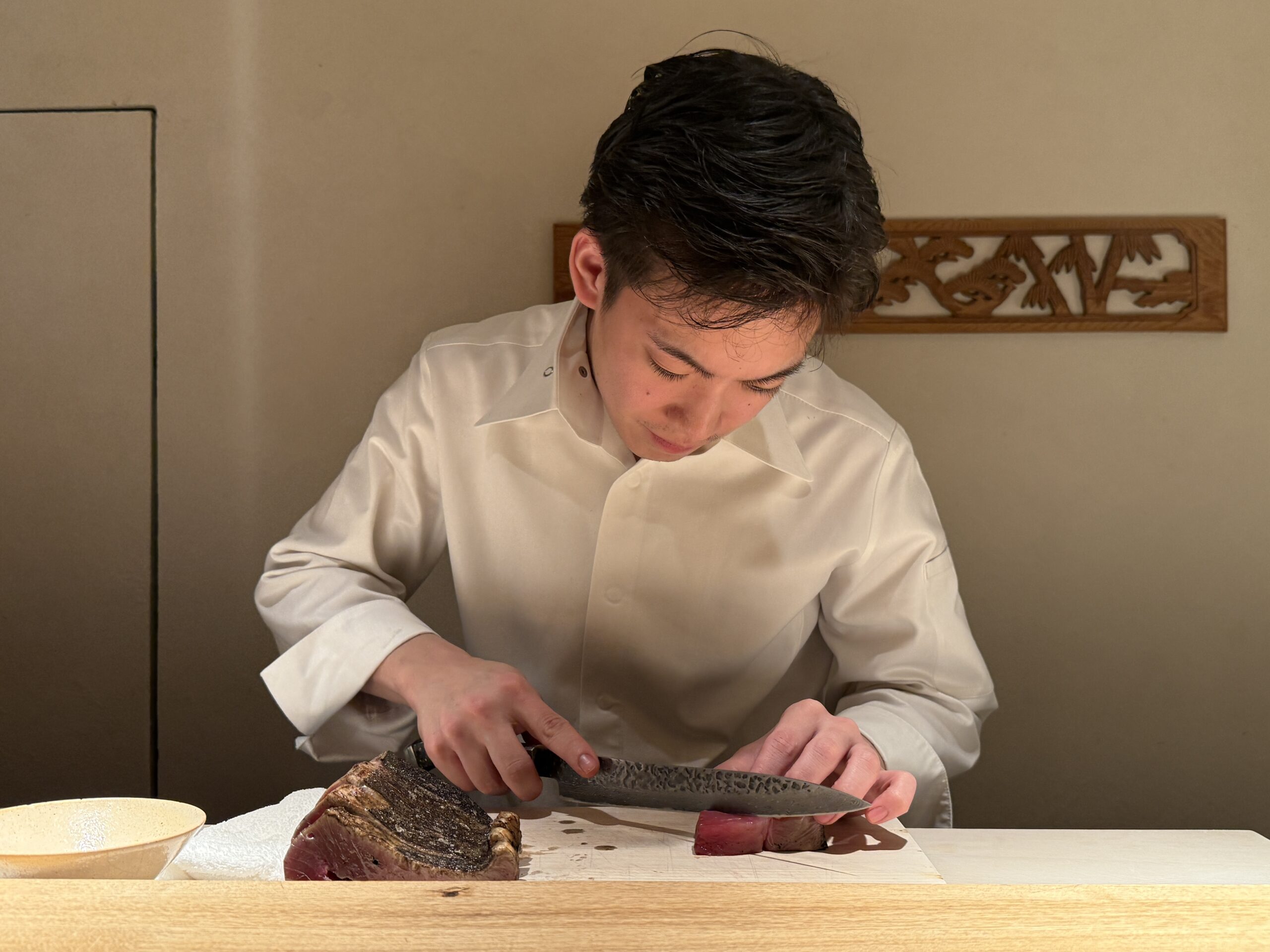 大将の藤井亮悟氏は1999年、千葉県生まれ。寿司職人だった父の背中を見て育ち、中学卒業と同時に大阪で修業をスタートした。京都の料理店、箱根の料亭での住み込み修行を経て、21歳で神楽坂の会員制店を料理長として立ち上げ。そして23歳で銀座に自らの店を構えた。カウンター7席、完全予約制。醤油やみりんに頼らず、素材そのものの力を引き出すことに信念を置く料理人だ。