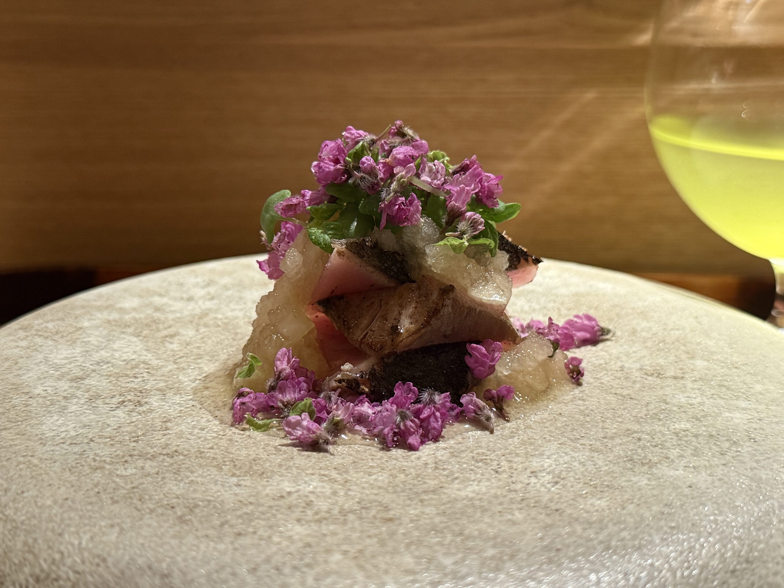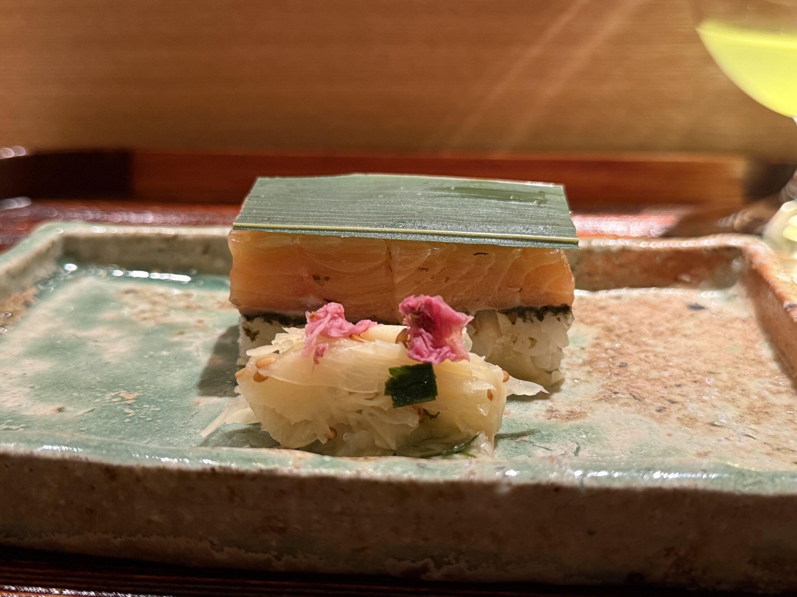 北海道のサクラマスは笹の葉をのせた押し鮨に仕立てられ、桜の花びらを添えた姿がまず目に華やかだ。口に運べば、押した米の密度とサクラマスの脂がしっとりと一体になる。春らしい一品。