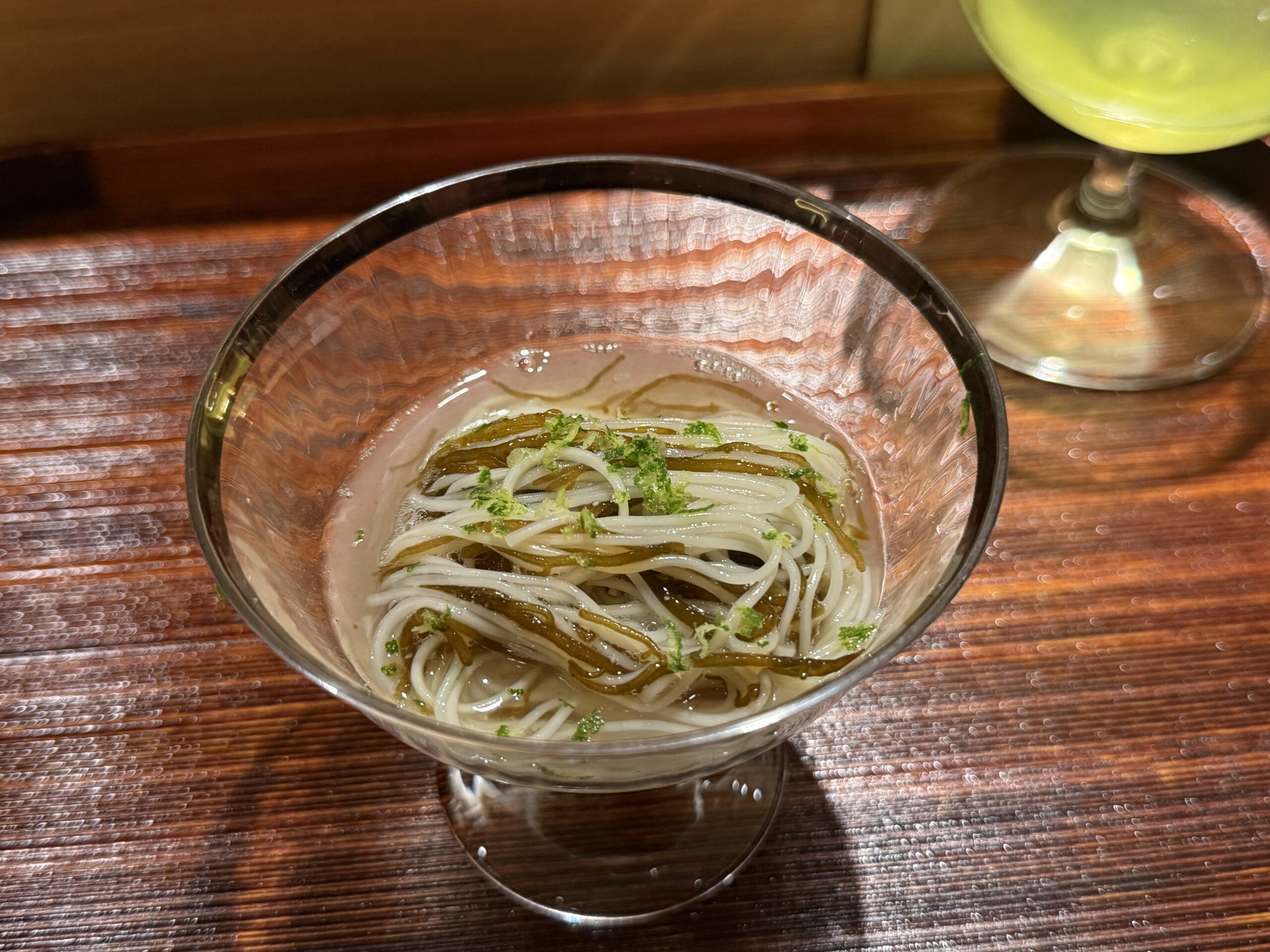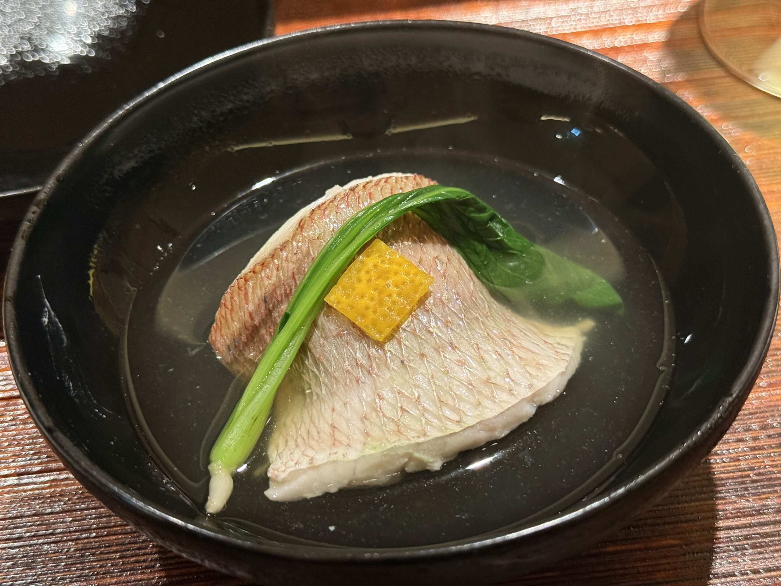 三重の春子鯛の椀は、この日のハイライトのひとつ。澄み切った出汁に身のふくよかさが溶け出し、柚子の一片が静かに香る。出汁の透明感と春子鯛の上品な旨みが、椀の中で完璧な均衡を保っていた。