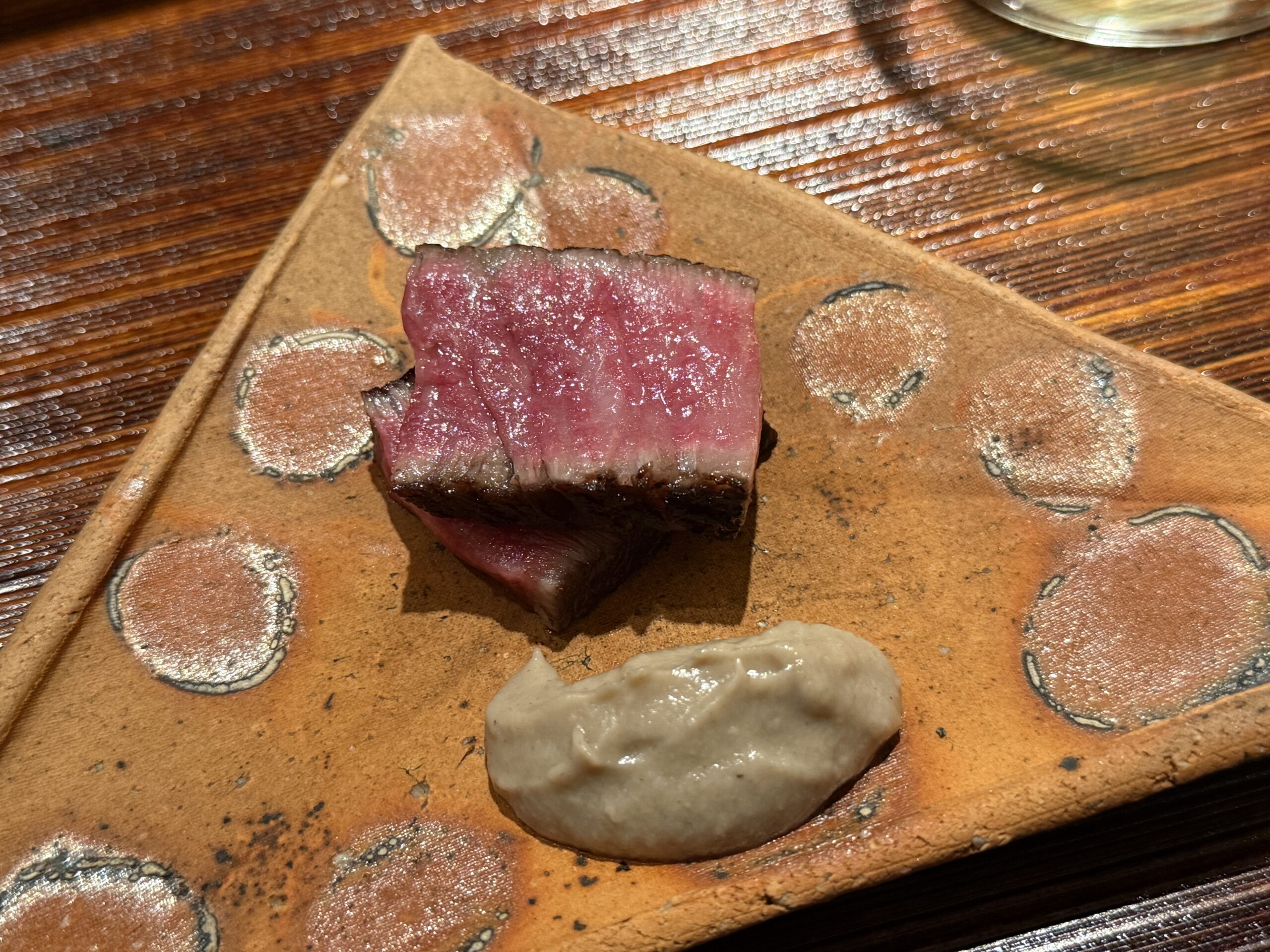 強肴は熊本・天草黒牛。断面の赤味が鮮やかで、ペースト状のソースとの組み合わせに独自のセンスが光る。肉の火入れは攻めすぎず、赤身の旨みを最大限に残す仕上がりだった。