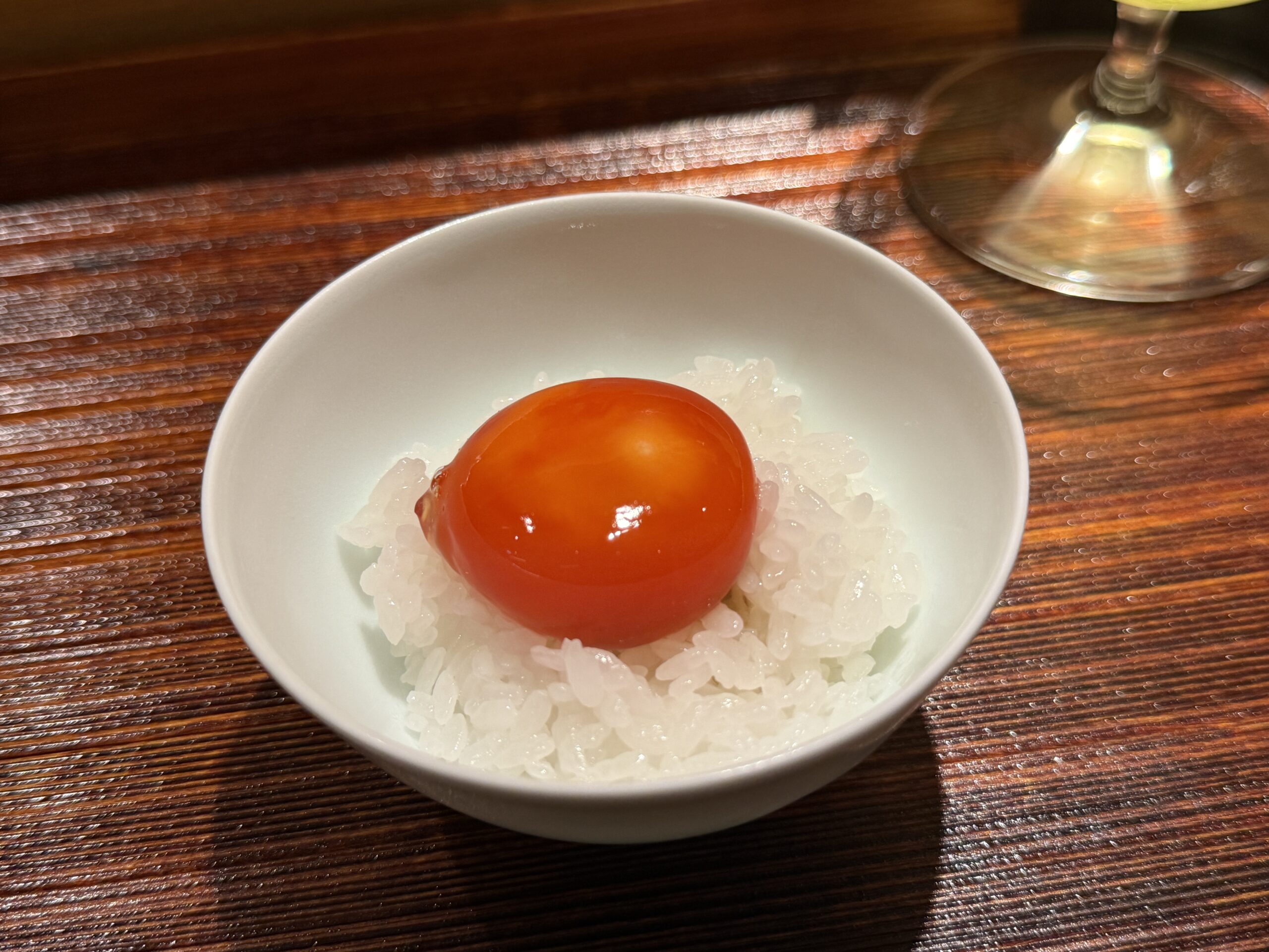そして食事。御殿場産の有涯米を蛍烏賊とクレソンで炊いた土鍋ご飯。藤井大将は自ら御殿場で米を育てており、この米がコースの核になっている。蓋を開けた瞬間、蛍烏賊の磯の香りが立ちのぼる。つややかな米に蛍烏賊の旨みが染み渡り、一杯目はそのまま、二杯目は卵黄をのせた追い飯で。最後の一粒まで隙がない。