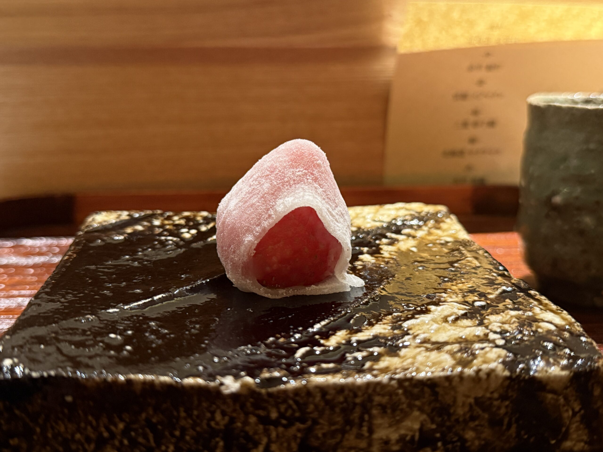 水菓子は胡麻のデセール、茶菓子に苺大福。最後まで丁寧に、コースを締めくくってくれた。